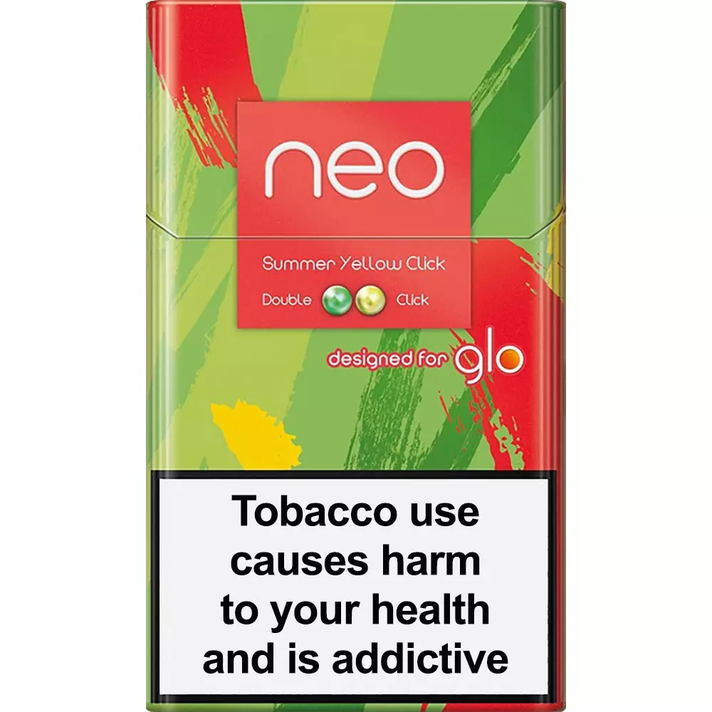 Neo Demi Summer Click has a mild tobacco flavor with two buttons that reveal sweet melon with citrus flavor, and tropical fruit notes. For use only with Glo Hyper line of devices.